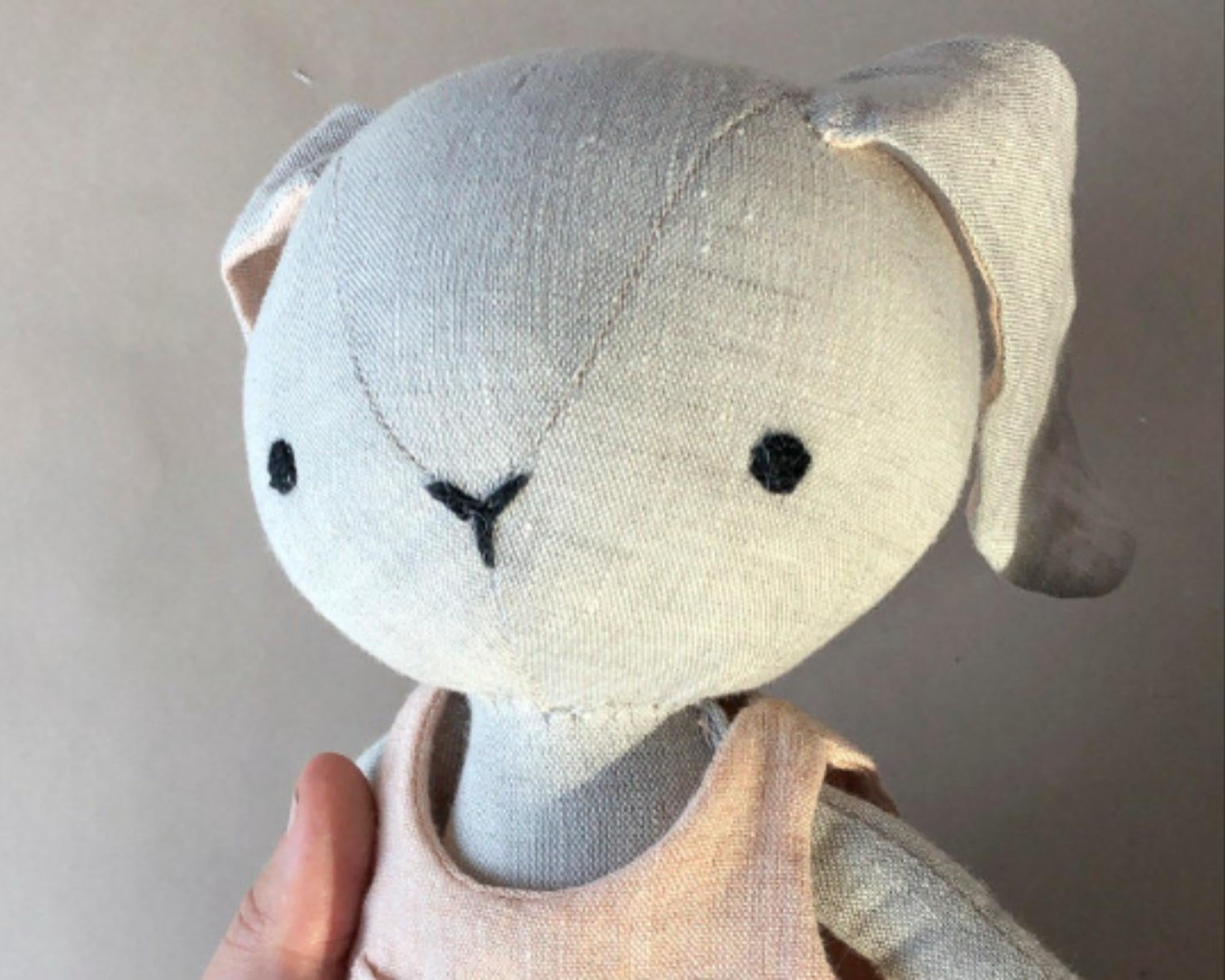 We used a 100% linen fabric for the bunny, a washed linen for the overalls and a cotton rib fabric for the beanie.
