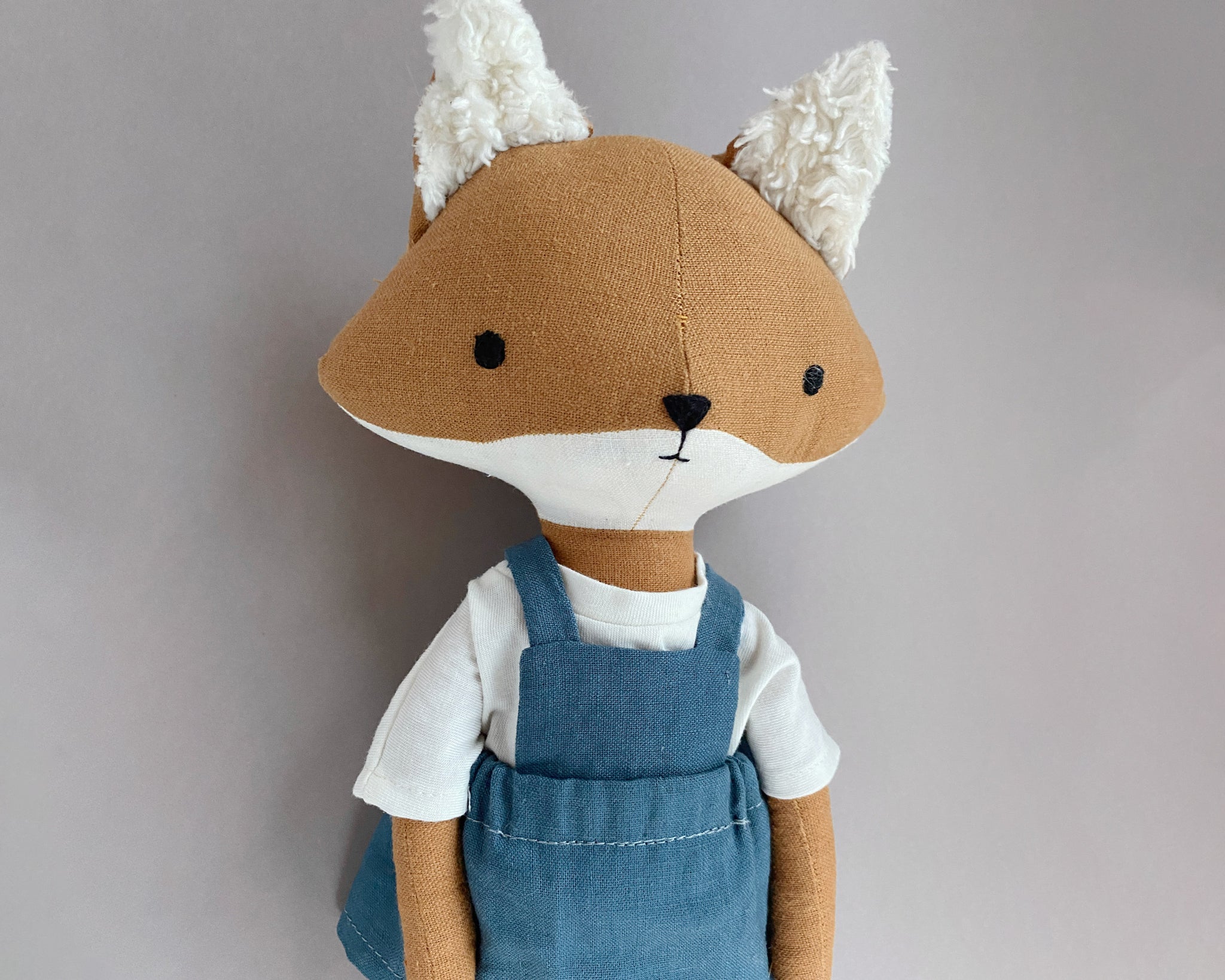 Download this sewing pattern for our sweet little fox doll, complete with a pinafore dress and t-shirt.
